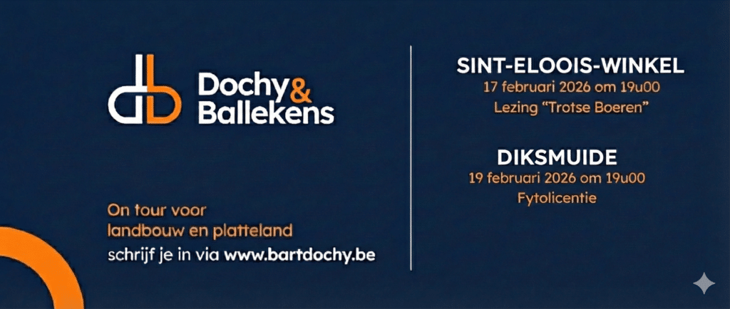 In samenwerking met het PraktijkCentrum voor Land- en Tuinbouw (PCLT) wordt 1 inspirerende avond georganiseerd die in aanmerking komt voor de fytolicentie. Deze opleiding geeft u inzicht in de toekomst van de landbouw en platteland, updates over beleidsveranderingen en de impact van internationale ontwikkelingen. Daarnaast wordt een tweede sessie georganiseerd waar een lezing wordt georganiseerd rond het boek van Bart Dochy “Trotse Boeren”.